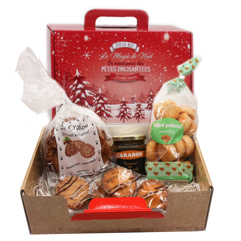 Offrez ou offrez-vous un délicieux moment de gourmandise avec le coffret de Noël "Esprit de Noël", une belle sélection de spécialités bretonnes artisanales présentées dans une élégante valise aux couleurs festives.